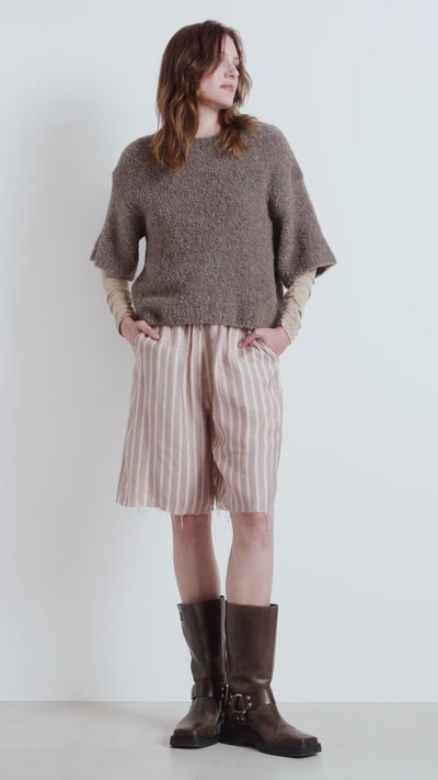 Afslappet og rummelig strik med 3/4 ærmer i bouclestrik.